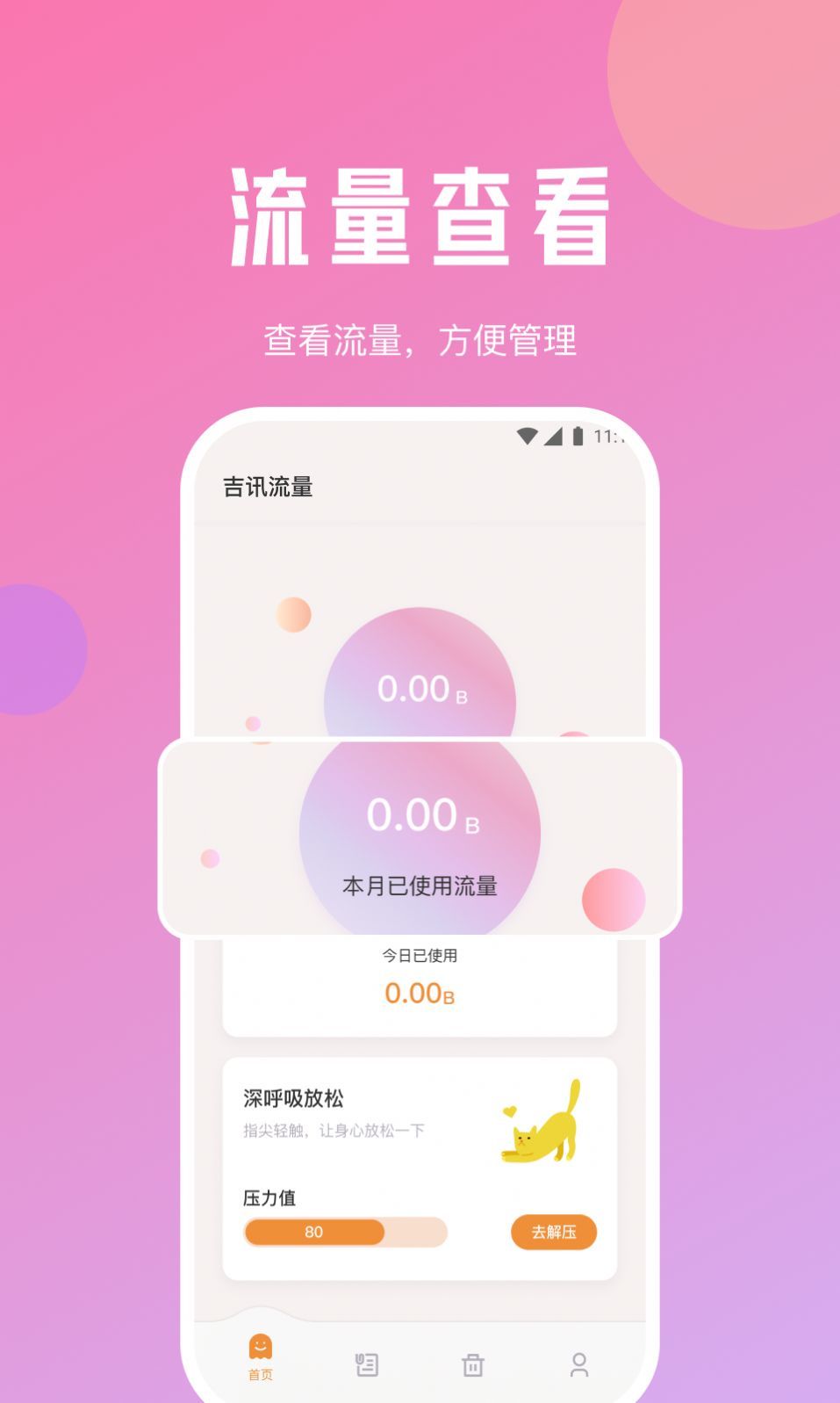 小编今天为大家推荐一款应用软件——吉讯流量软件app,帮助用户准确掌握手机流量使用情况,有效控制流量使用,界面非常的简洁明了,以及各应用程序的流量使用情况,等到流量用到一定程度以后也会进行提醒,用户可以了解自己的流量消耗情况,通过这些数据我们也可以清楚自己的流量剩余,有规划的实用流量,准确的获取用户的流量实用情况,吉讯流量软件app用起来非常简单,UI设计也很友好,v1.0.0安装包小巧下载快,一起来试试吧!