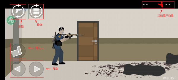 左下角是左右移动。上面一点是腿攻击。左上角是换枪。旁边是换弹。
