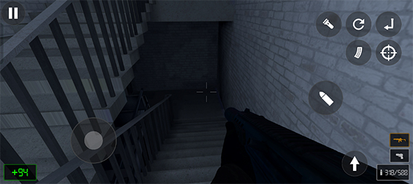 2、操作容易简单,左边控制人物移动方向,右边控制射击、换弹、瞄准等操作。