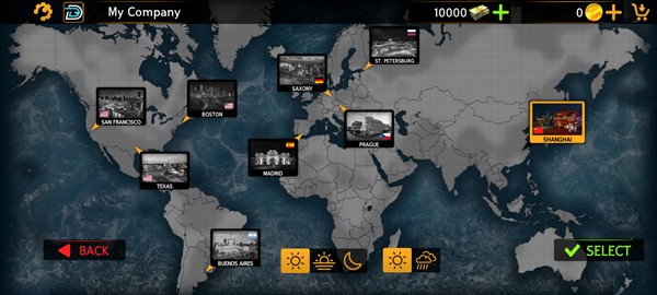 3、选择你想要去的地区,游戏内有各种现实的城内和城外地图:美国(旧金山和德克萨斯)、南美洲(布宜诺斯艾利斯)、欧洲(德国、西班牙、布拉格、圣彼得堡)、迪拜、上海等等,还可以在下方选