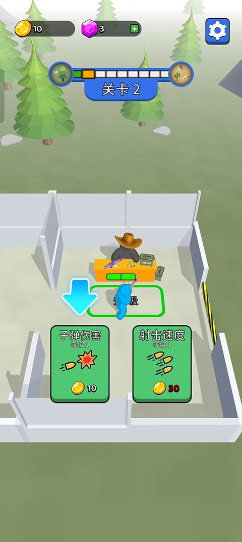2、具备有升级体系,玩家可以使用金币提升枪支的射击速度或者是子弹的伤害值。