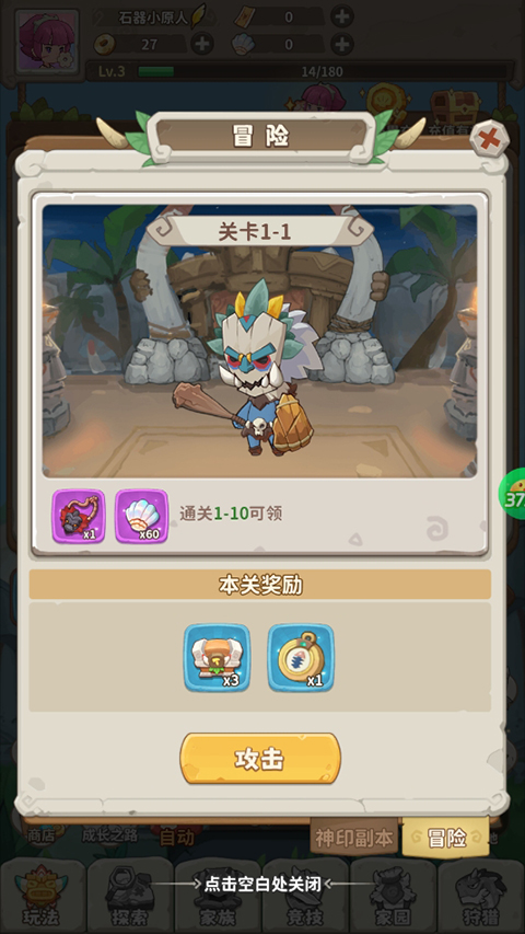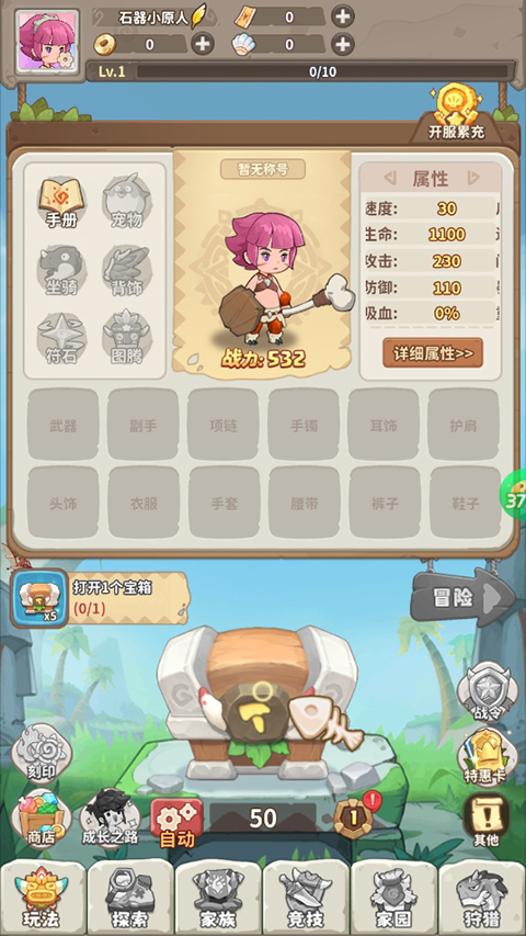 冒险与召唤0.05折游戏是一款非常有趣的放置策略冒险游戏。游戏以远古的石器时代作为背景,采用了Q版卡通风格设计,画面充满了原始时代元素风格。玩家在游戏中化身成为一名原始人,在游戏中不断的开箱获取各种装备武器,高品质的武器可以留下来使用,低品质的无用装备可以出售换取金币。带着你的装备进行战斗,战斗采用了放置自动系统,轻松完成战斗,获取通关奖励。不断的建设你的家园,推动部落的发展。感兴趣的玩家快来下载游戏,一起开启一场游戏之旅吧!